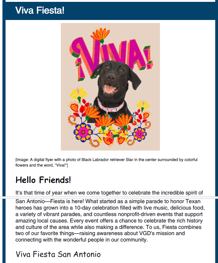 Vision Guide Dogs was founded in 2022 as a nonprofit organization devoted to improving the lives of individuals who are blind or visually impaired. We offer canine-guided sight to individuals who are interested in being matched with a guide dog to enhance their mobility. Our in-home, client training model is personalized and offers post-graduation support to ensure long-term team success. We are able to carry out our mission because of our incredible volunteers. If you are interested in learning more about applying for a guide dog or how you can help with our mission, we would love to talk with you!